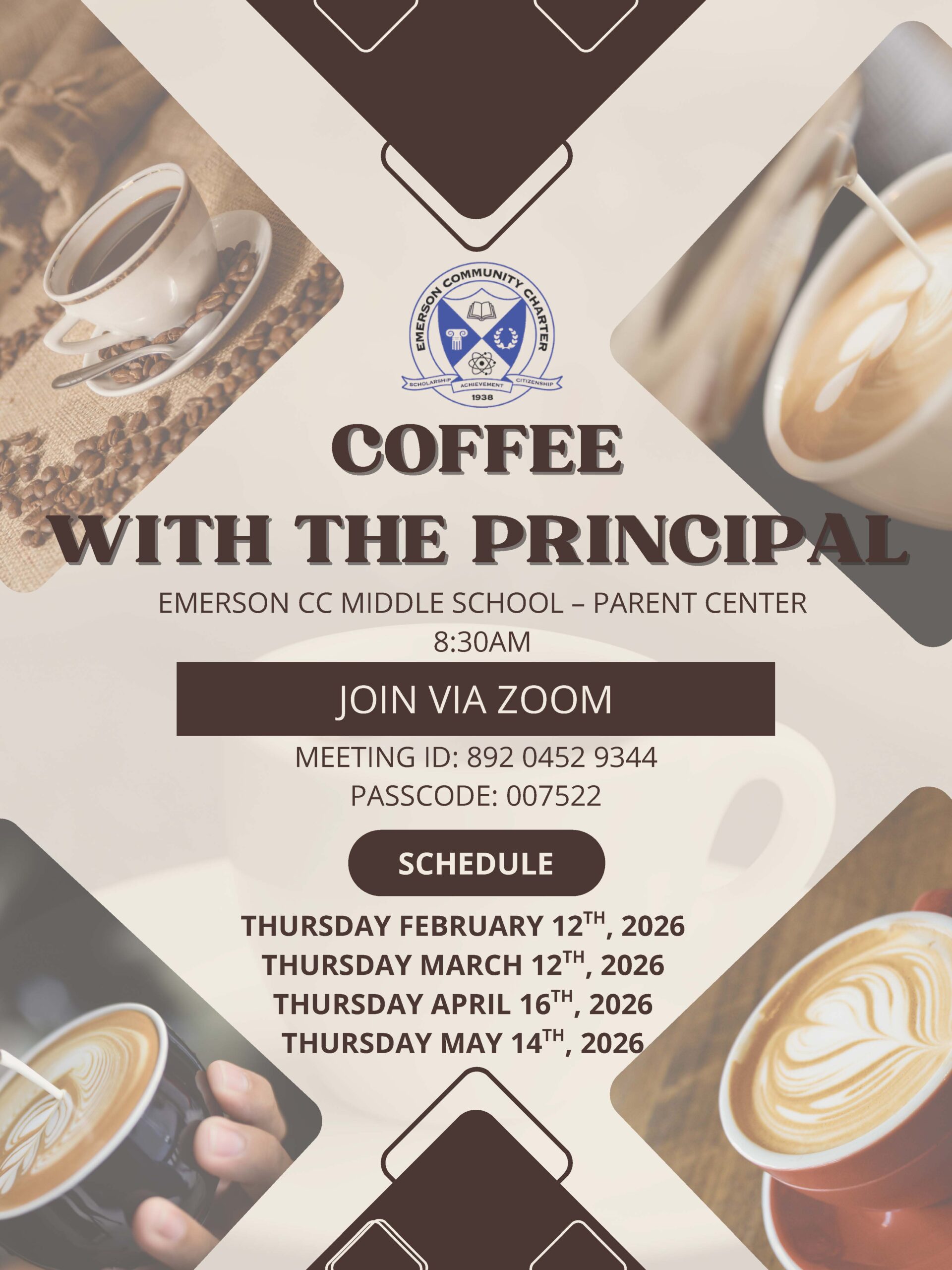 Coffee & Tea with Dr. McNally (or Ms. Bommarito as interim principal), Principal of Emerson Community Charter (8:30 – 9:00 am)